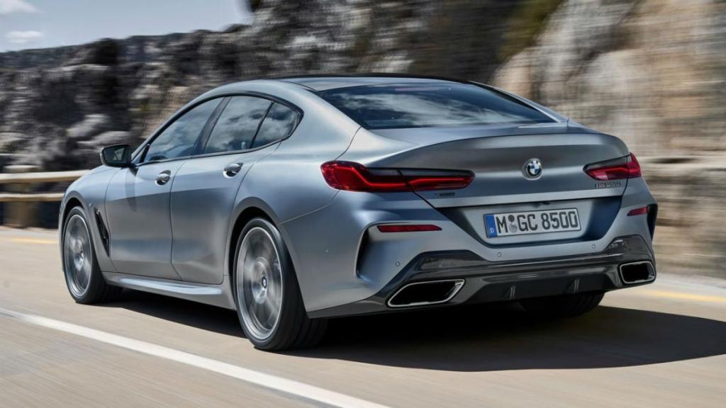 BMW M850i xDrive Dravitgrau metalizado, vista de tres cuartos de la parte posterior izquierda.