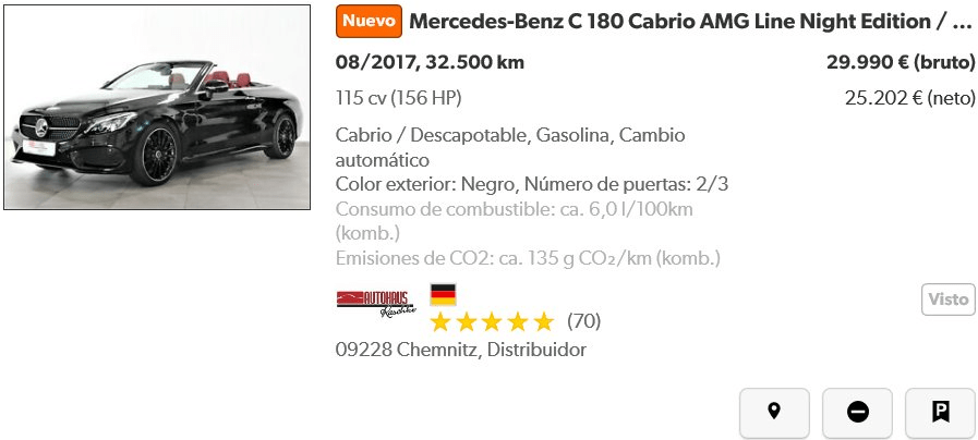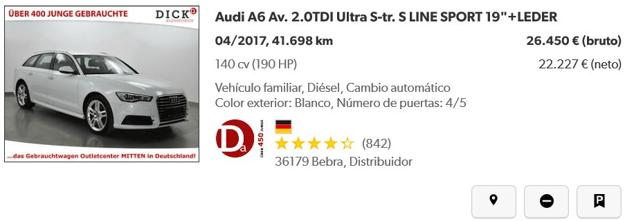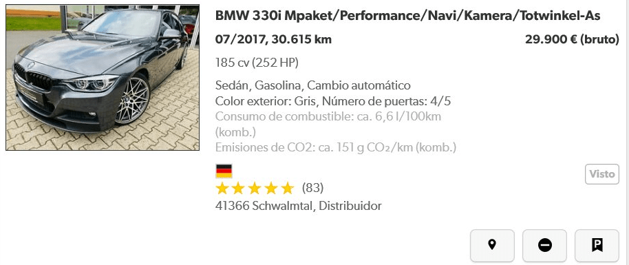 Fue desarrollada en 1996 y desde entonces es la aplicación más popular para la compra de vehículos en Alemania. Te permite ver las valoraciones de los concesionarios, evaluar el precio del coche respecto al precio del mercado y muchas otras funciones que hacen mucho más fácil esta tarea. Yo personalmente he comprado un coche a través de esta aplicación y le dedico varias horas a la semana a la búsqueda de ofertas realmente interesantes que ni de lejos se encuentran en España. Al final de la publicación os adjunto unas capturas.